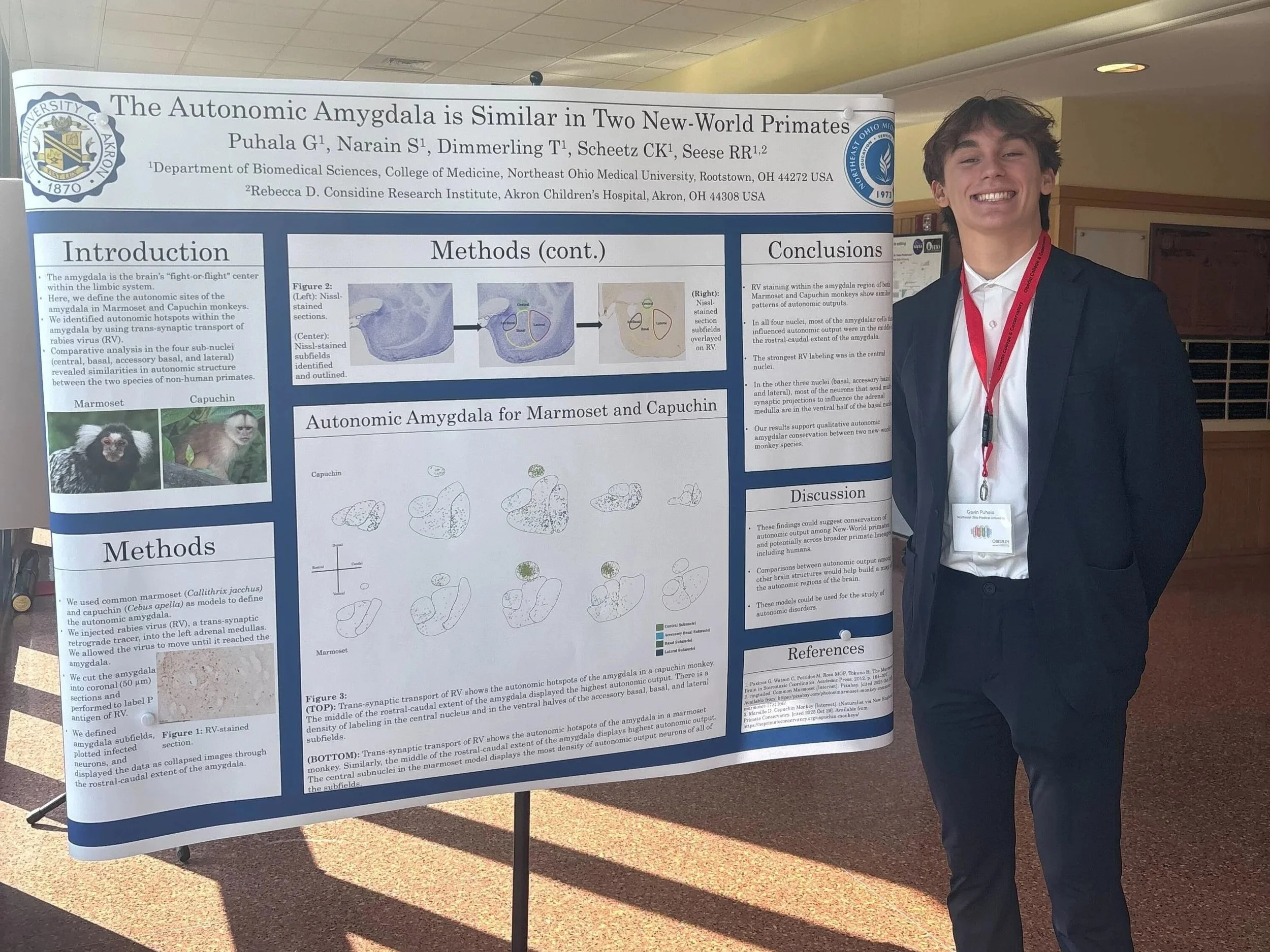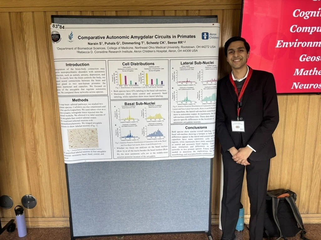 Sridhar presented his poster titled “Comparative Autonomic Amygdalar Circuits in Primates.” His research revealed cell distribution patterns within the basal and lateral sub-nuclei of the amygdala, showing both shared organization and species-specific differences in autonomic connectivity. These findings help clarify how autonomic circuits vary across primates, such as Marmosets and Capuchins, and may inform future studies of human neurobiology and neuropsychiatric conditions. He’s known in the lab as our “Histogram Wizard,” because of his awesome Histograms. Great Job Sridhar!
